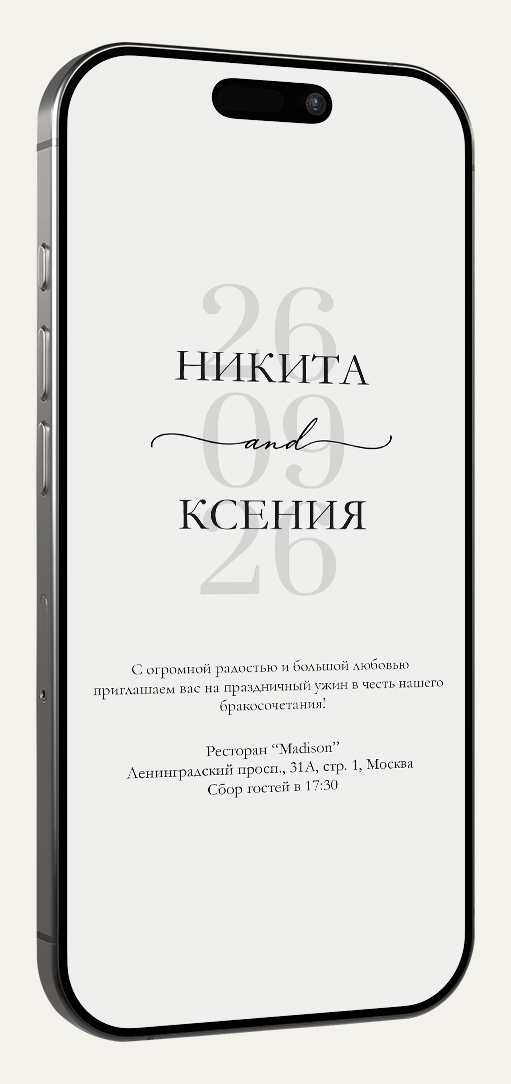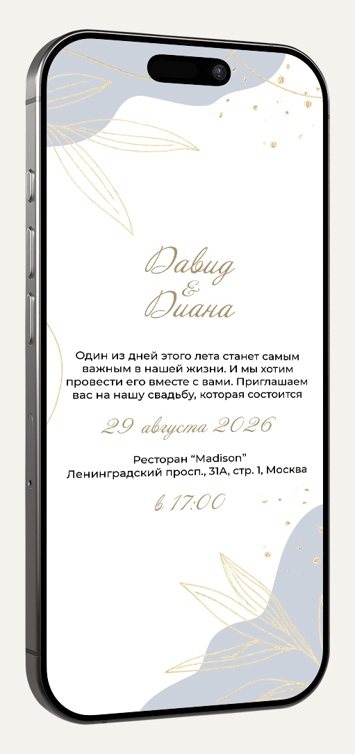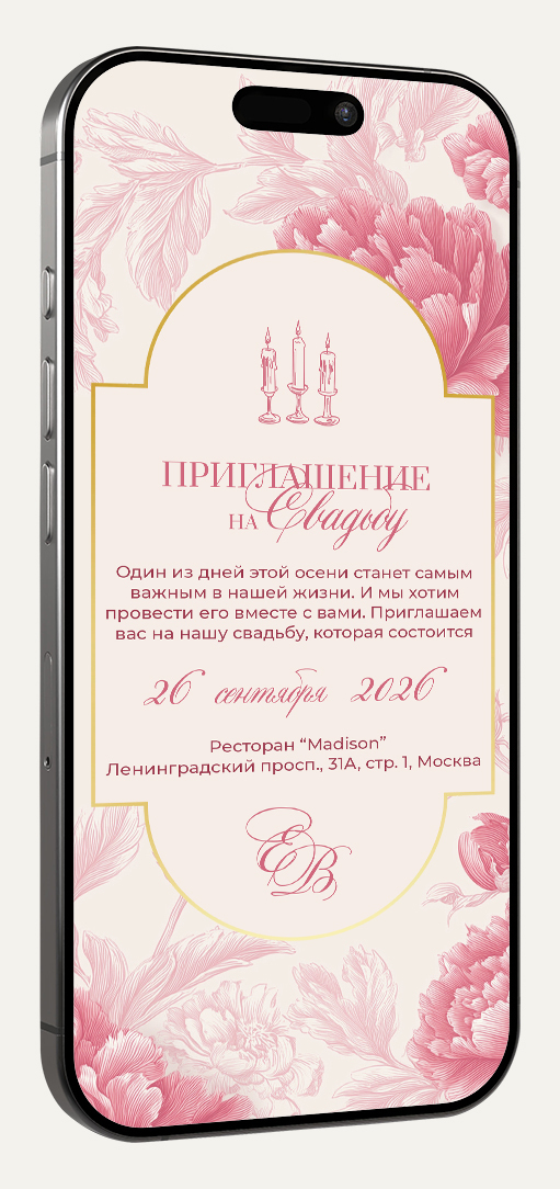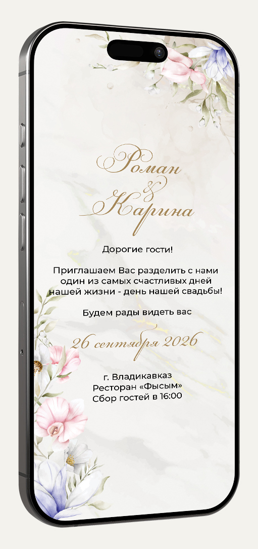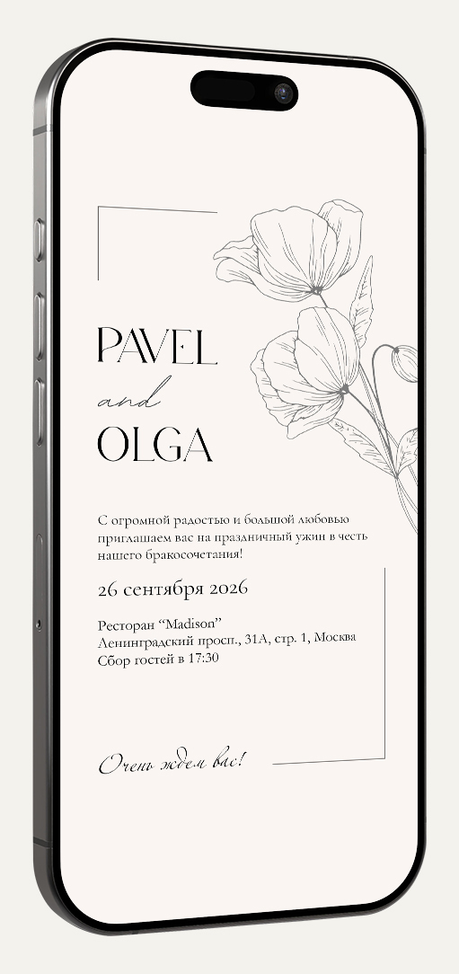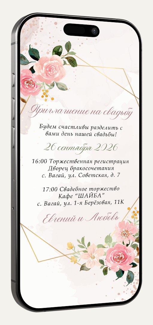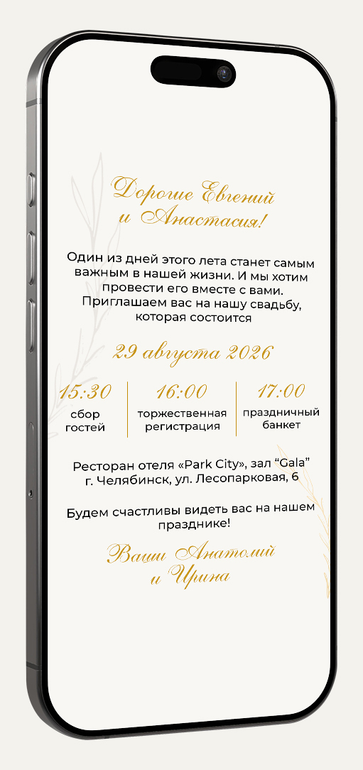 Приглашение в формате картинки идеально для отправки в мессенджерах (ВКонтакте, Telegram, WhatsApp). Легко персонализируйте его, добавив имя гостя для особого тепла и внимания.